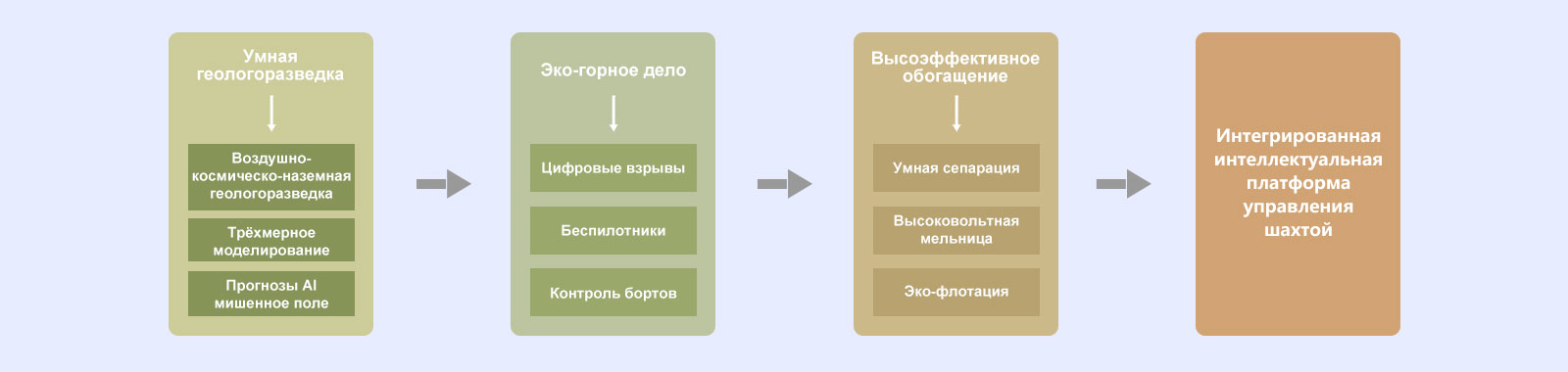 Технологии – основной двигатель модернизации горнодобычи. Мы стремимся системно внедрять передовые концепции поиска месторождений, интеллектуальное оборудование и экологически чистые технологические решения в проекты, создавая современные «умные шахты». Наша цель – цифровизация всей горнодобывающей цепочки: от поиска и разведки до добычи, обогащения и выплавки, формирование более безопасной, эффективной и устойчивой производственно-сбытовой цепочки, становясь эталоном для местных компаний и демонстрируя примерное развитие горнодобывающей отрасли в странах реализации проектов. Наша технологическая стратегия строится вокруг четырёх ключевых направлений: точный поиск месторождений, экологичная добыча, эффективное обогащение и чистая выплавка. В конечном итоге, через концепцию «умной шахты» мы достигаем высокой конкурентоспособности и устойчивости. Реализация платформы технологий разведки и строительства «умной шахты» демонстрирует полный цикл «технология – платформа – эффективность».